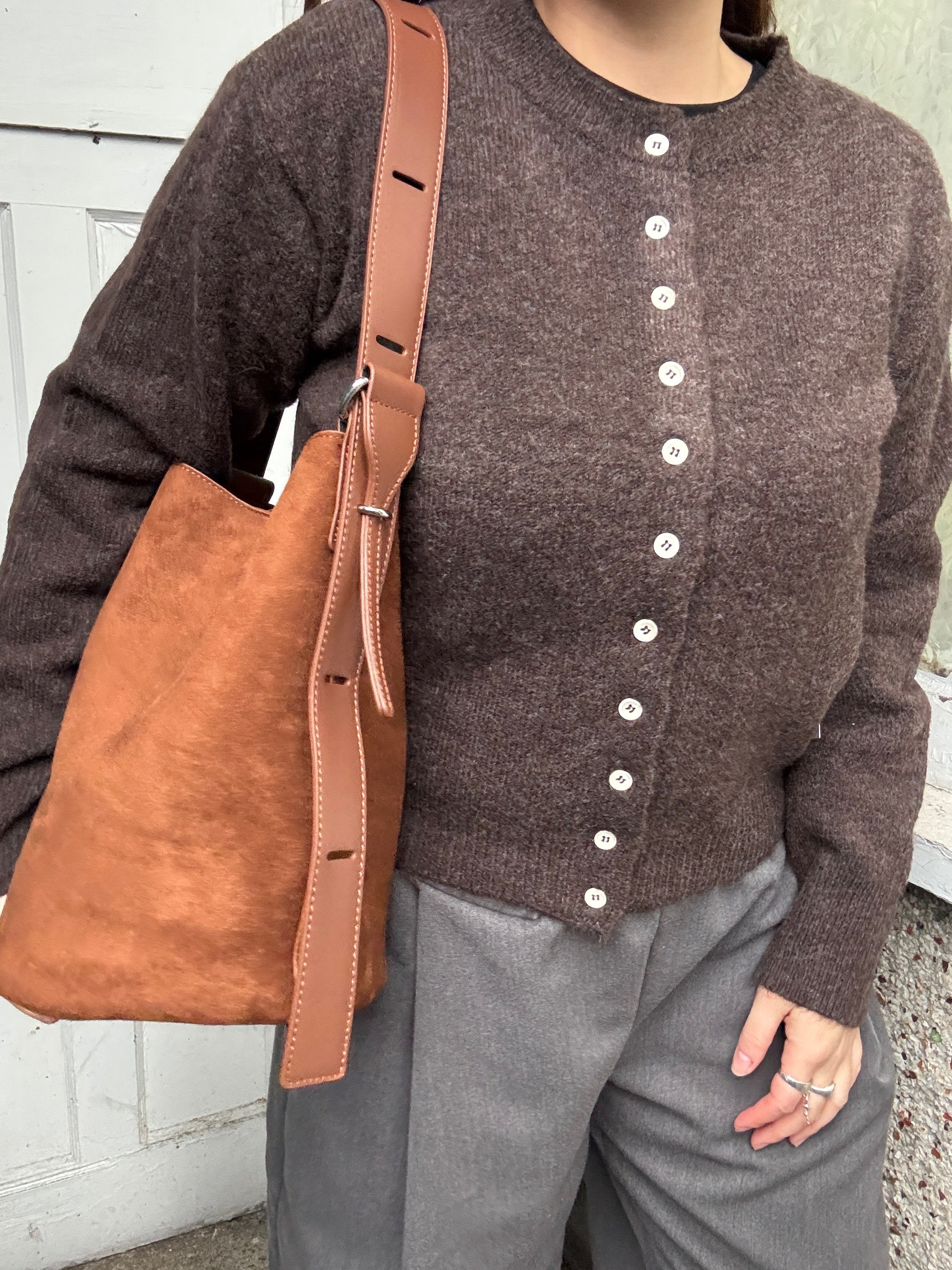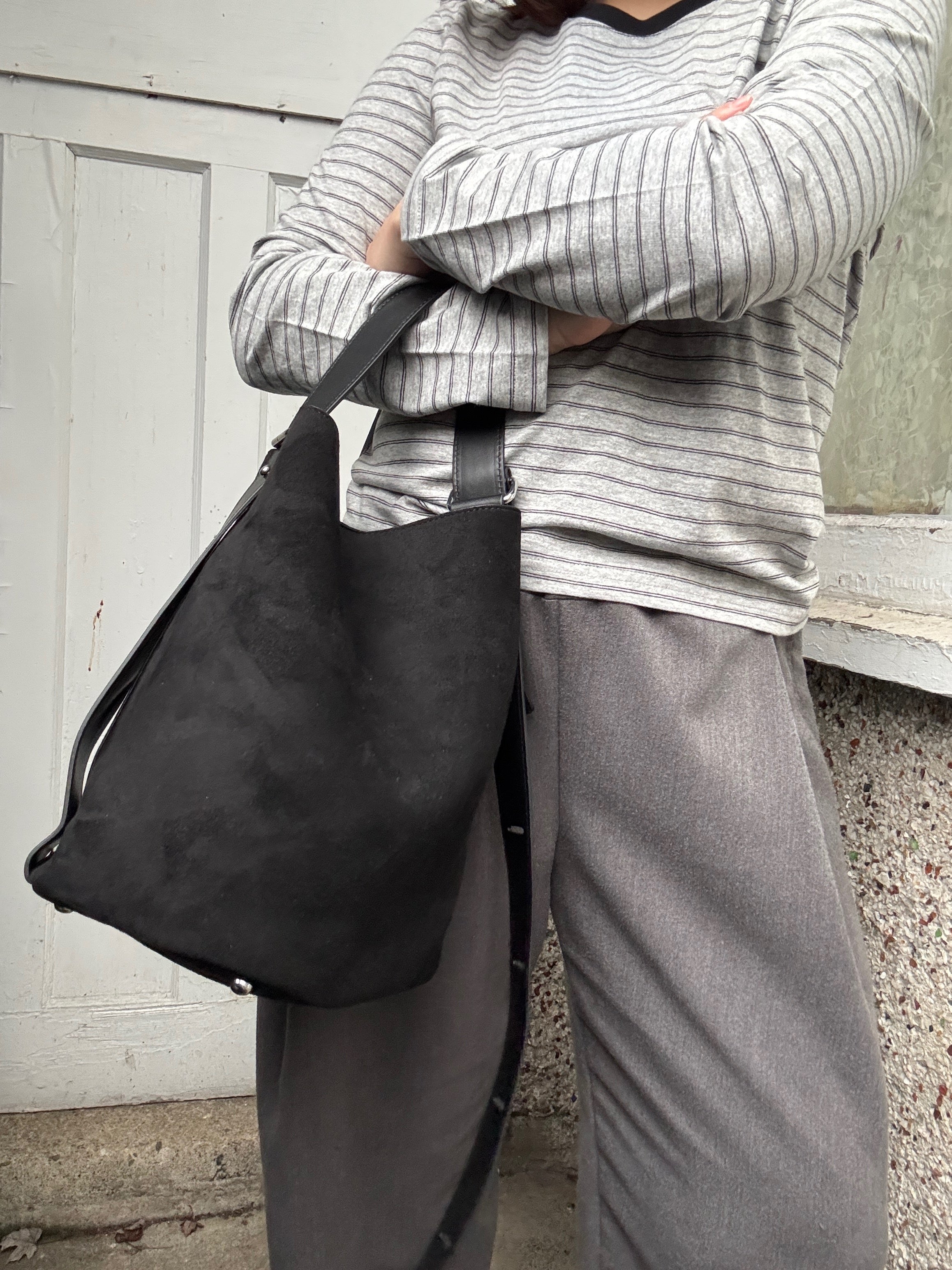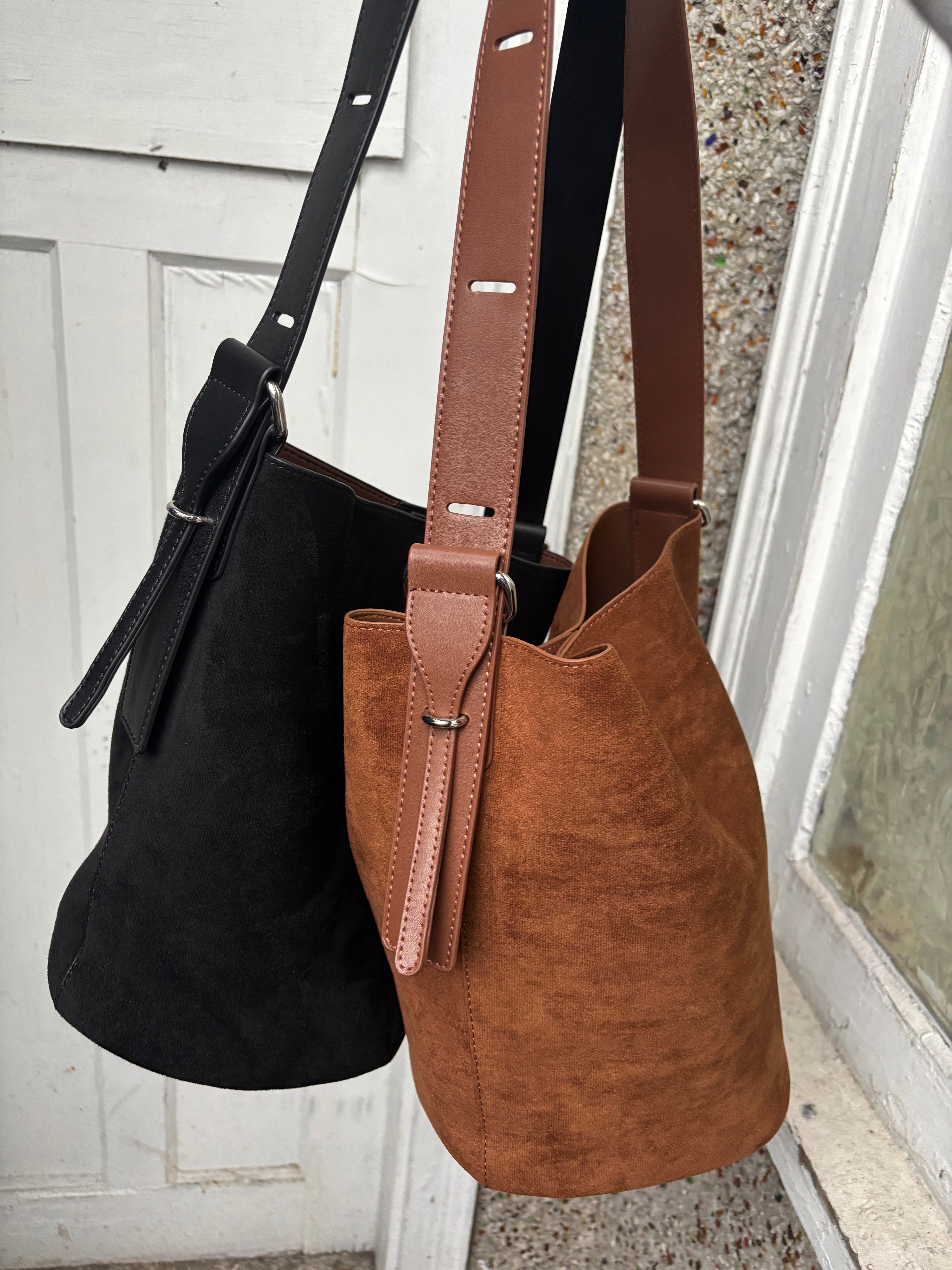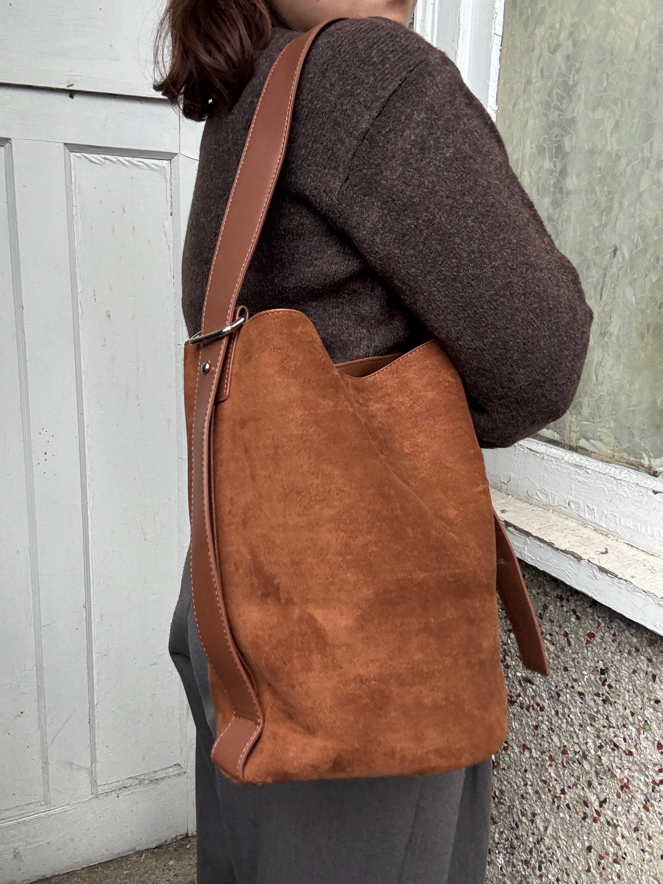 This faux suede bucket bag is as versatile as it is gorgeous, with structured faux leather straps featuring adjustable metal buckles so you can wear it however you like—shoulder, crossbody, you name it. The metal feet add a luxurious feel, protecting your bag from dirt and grime when you set it down, keeping it looking fresh. Stylish, practical, and ready for whatever comes your way.