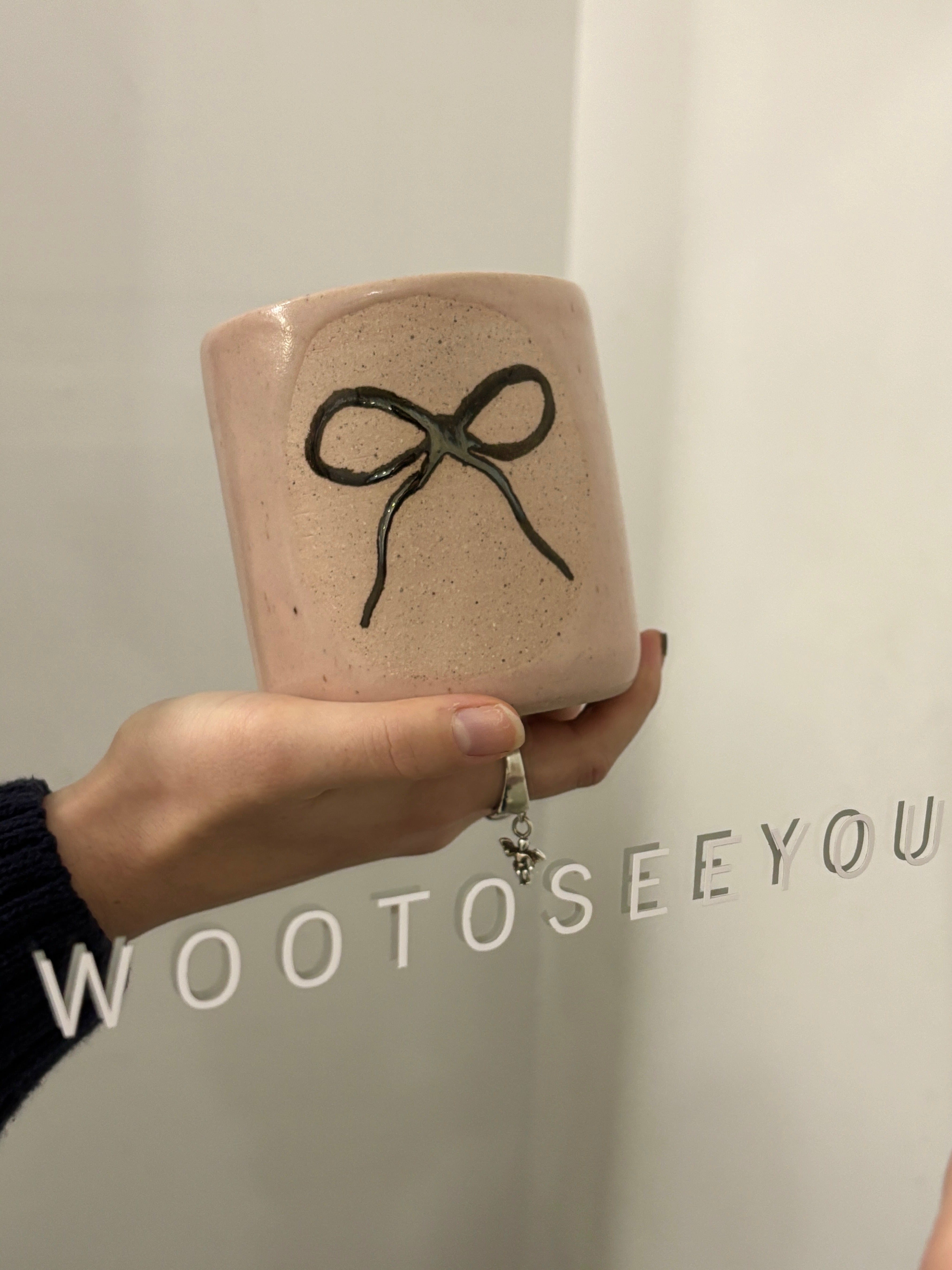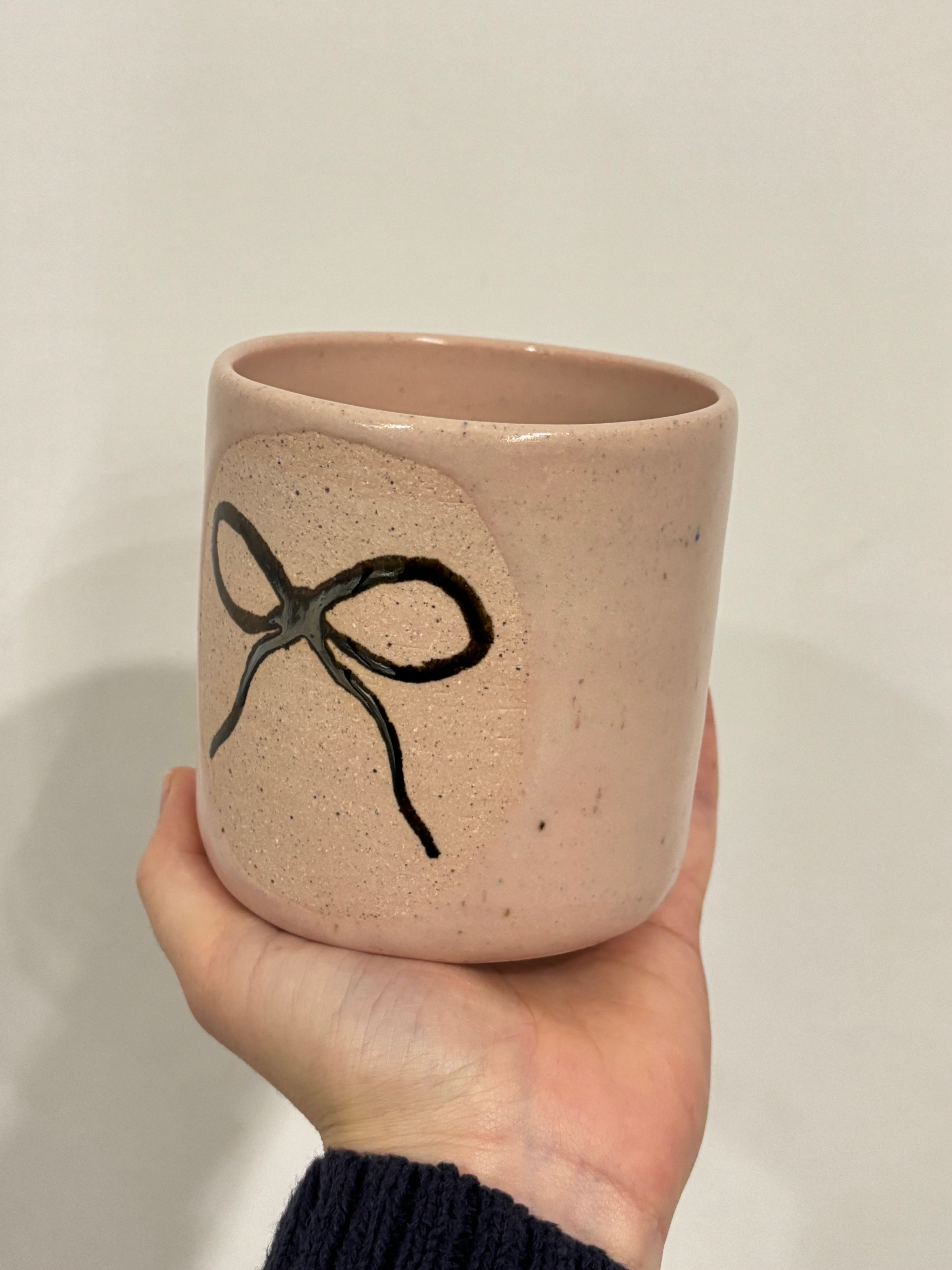 Cutie handmade tumbler with a painted bow. Handmade by local ceramic artist - Kirsten Crisostomo.