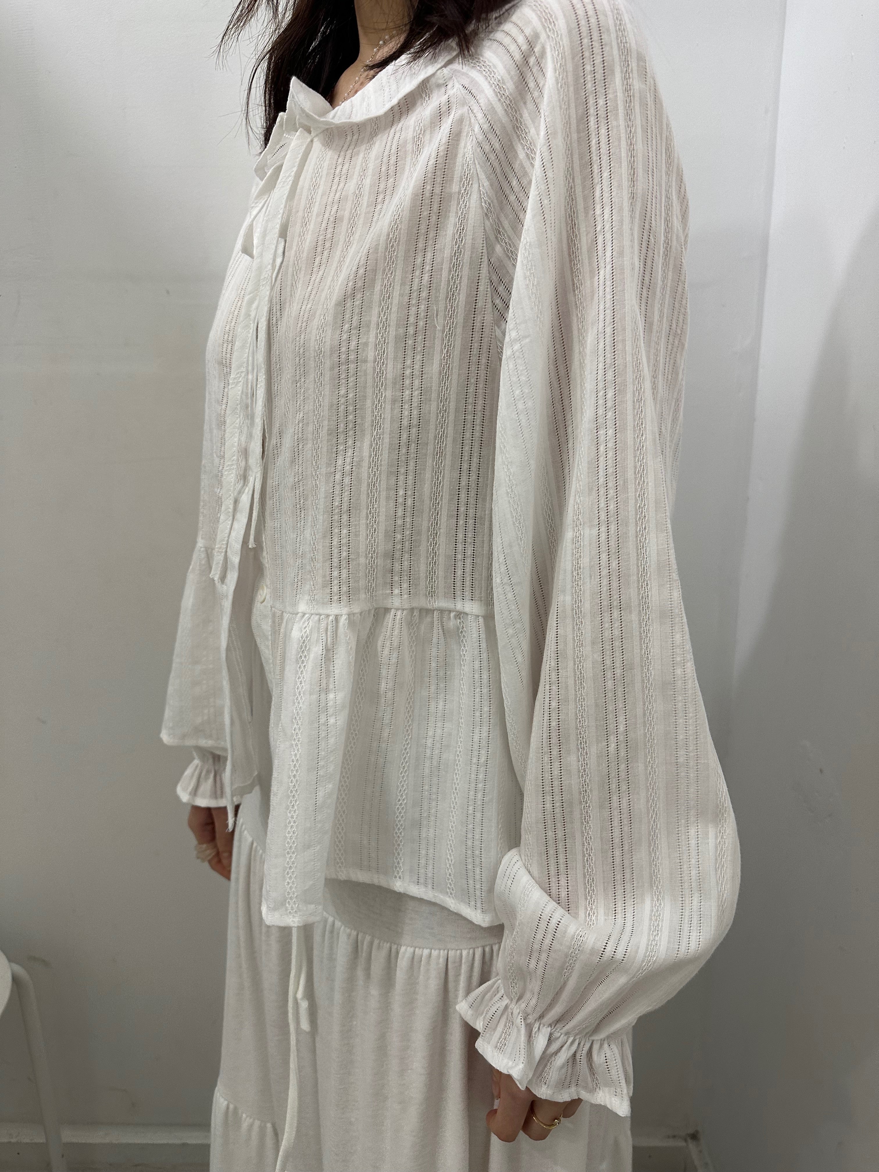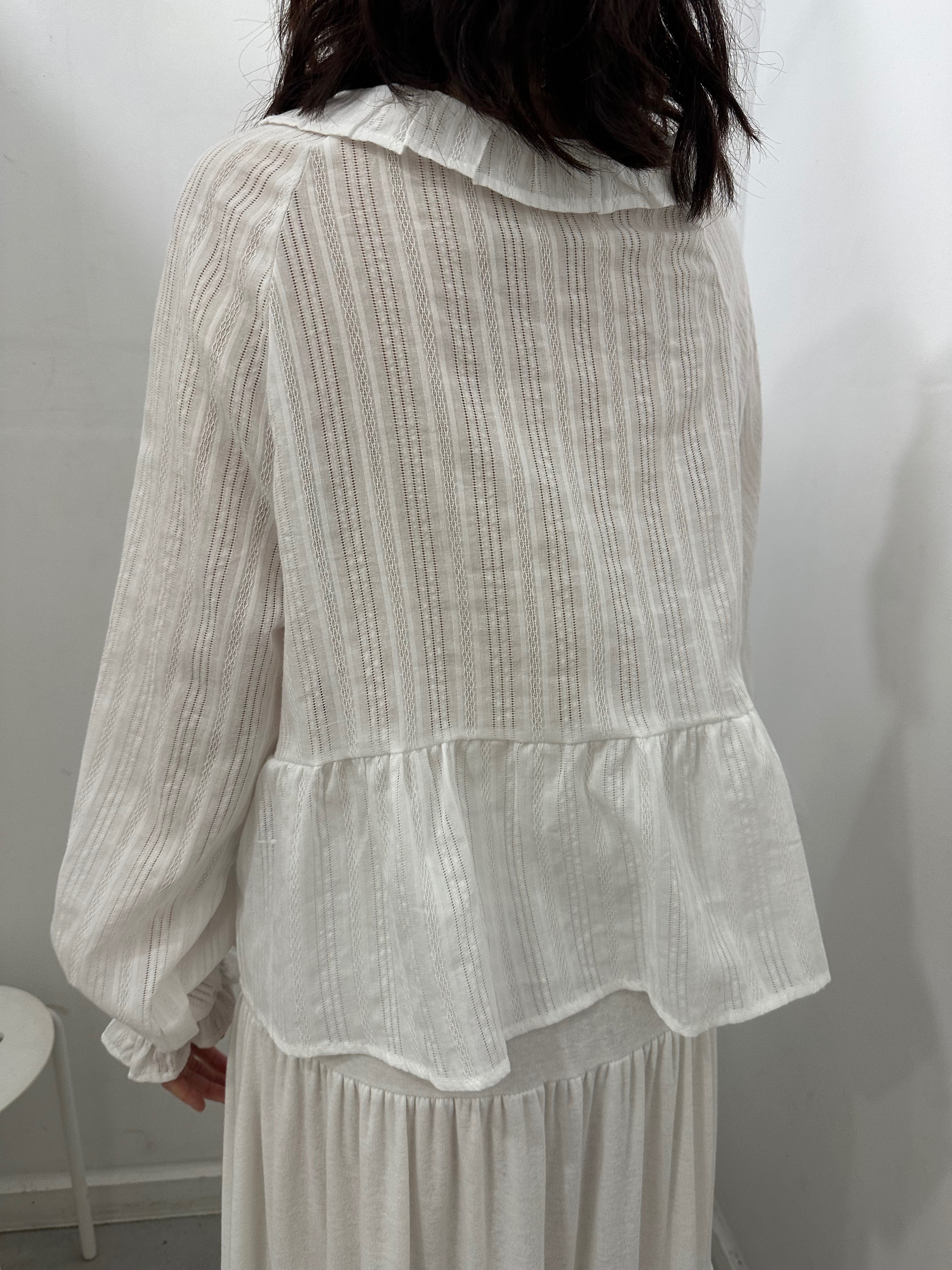 Embrace your inner dreamer with this whimsical top featuring a charming Peter Pan collar and delicate tie-front closure. The flowy silhouette moves beautifully with every step, while ruffled cuffs add a touch of vintage-inspired charm. Perfect for those who love a bit of playful elegance in their everyday style.