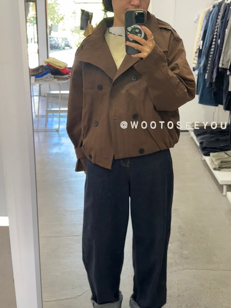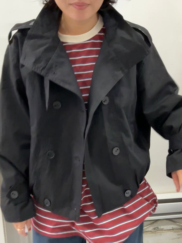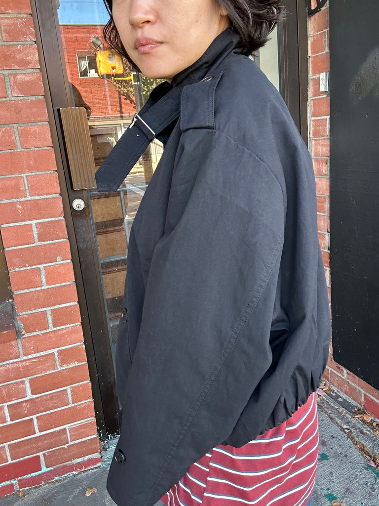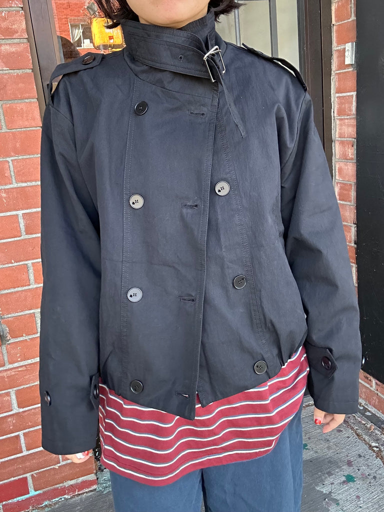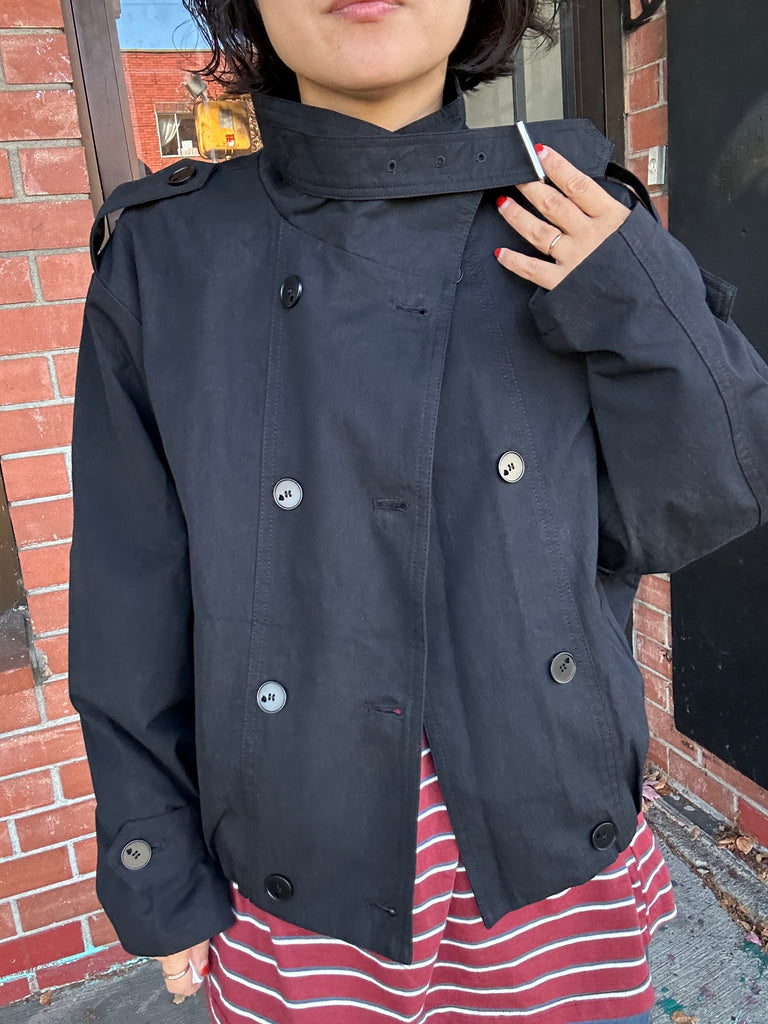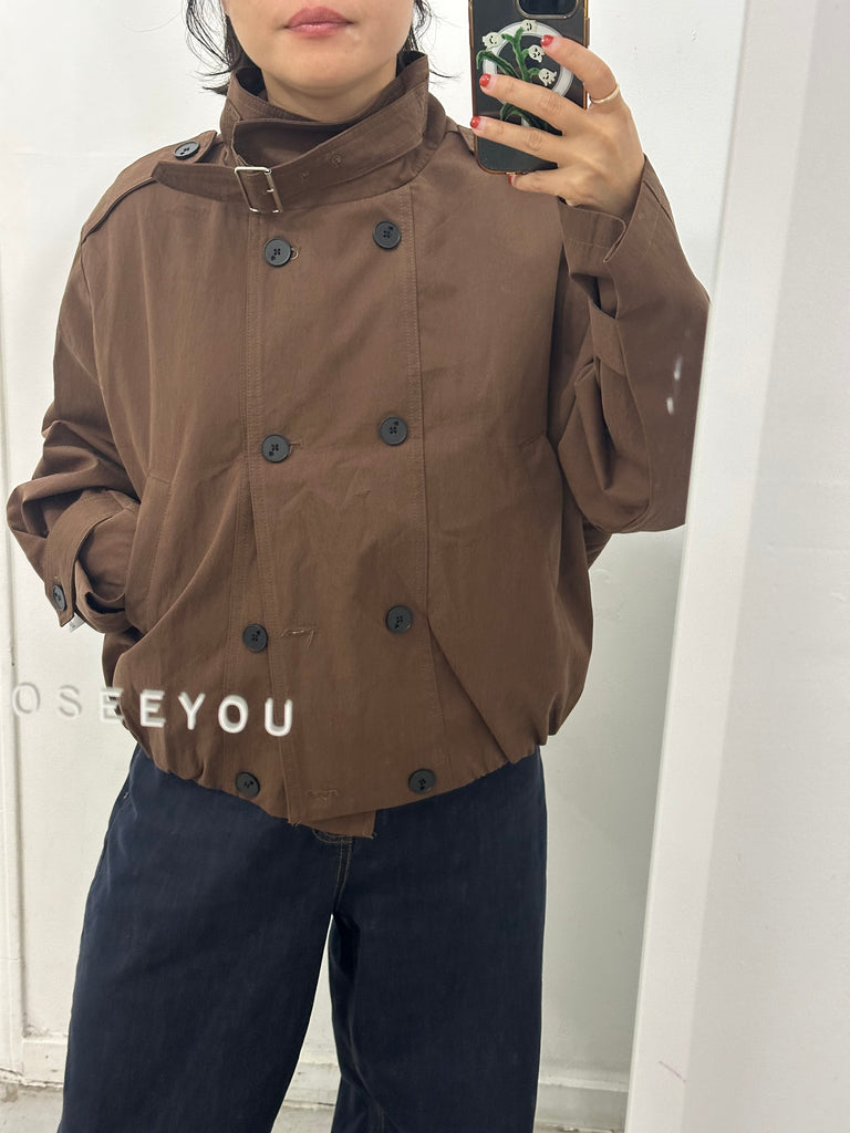 Stay cozy and chic with this cropped trench jacket featuring button closures and an elastic waistband for a snug fit. The playful bucket strap around the neck adds an extra layer of warmth while giving your outfit a fun twist. Perfect for keeping cozy without sacrificing style!
