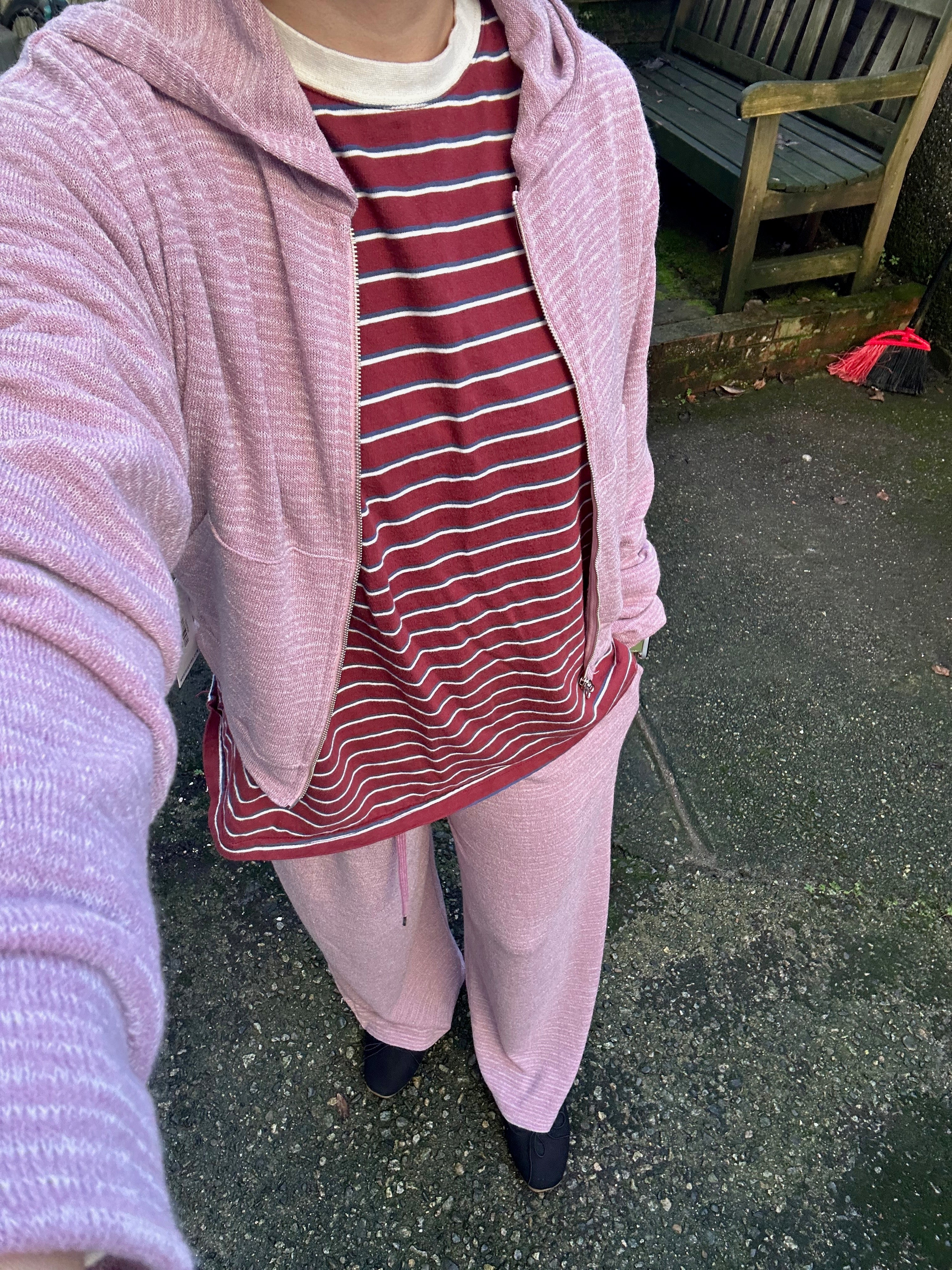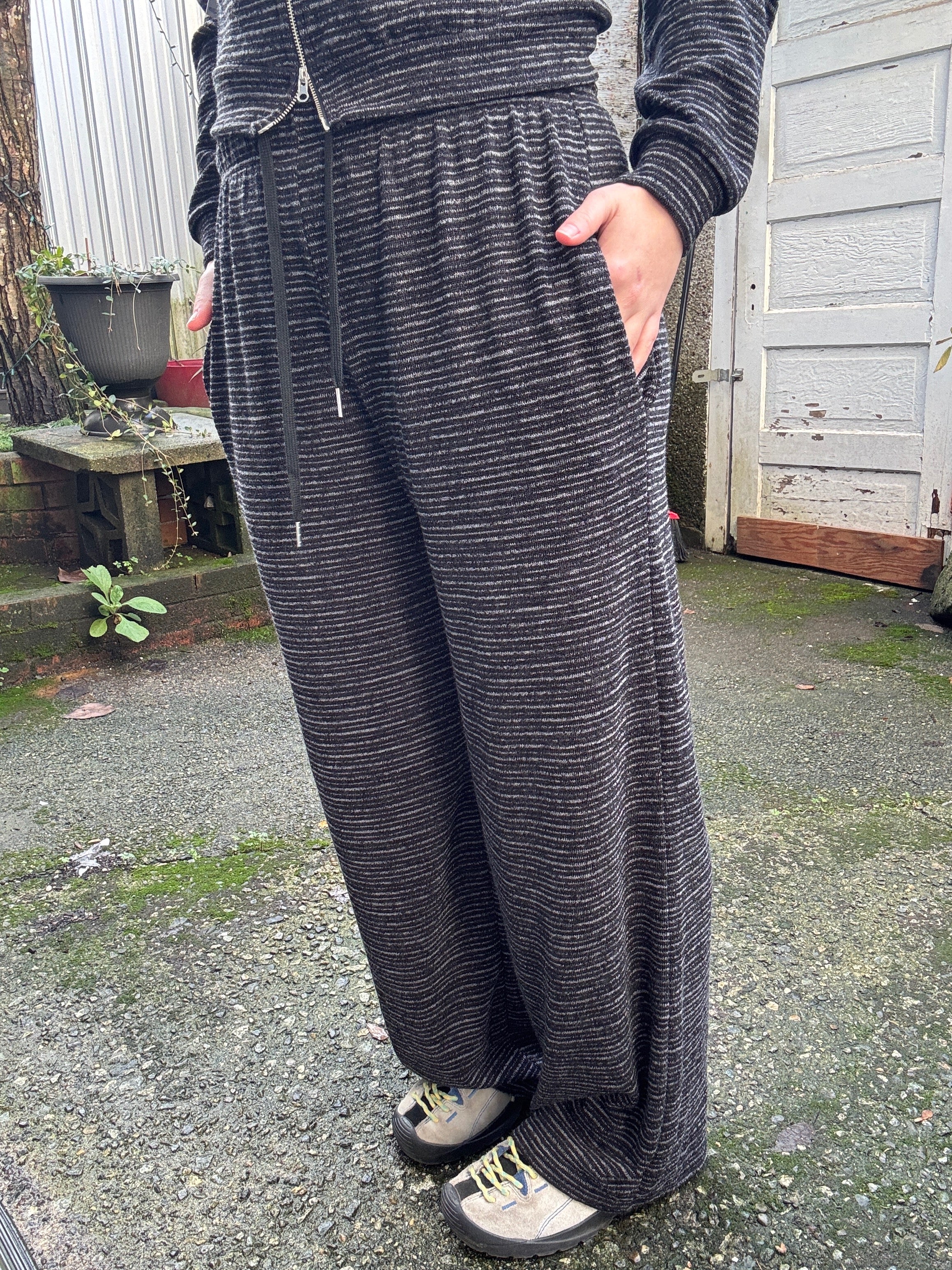 Slip into pure comfort with these striped knit pants—the perfect blend of cozy and chic for your downtime wardrobe. Featuring a relaxed fit and adjustable drawstring waistband, they're designed to move with you whether you're lounging at home or running errands. The playful striped pattern adds a fun touch to your everyday style, while the soft knit fabric keeps you feeling effortlessly put-together all day long. Get the set and check out zip up 122827.