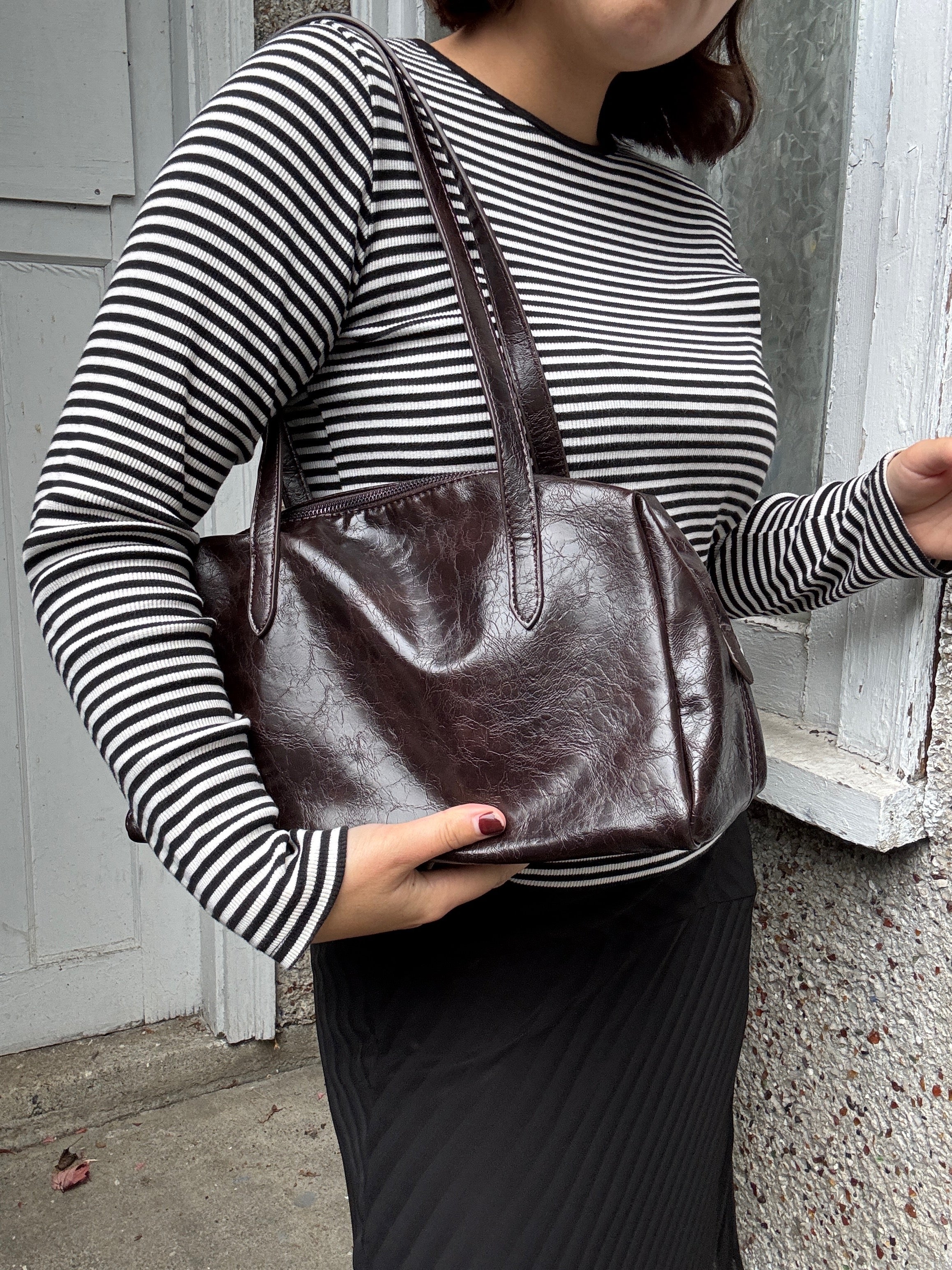 Meet your perfect medium-sized companion — this faux leather shoulder bag easily transitions from day to night. Its sleek design adds a playful touch to any outfit while offering just the right space for your essentials, making every outing effortlessly stylish.