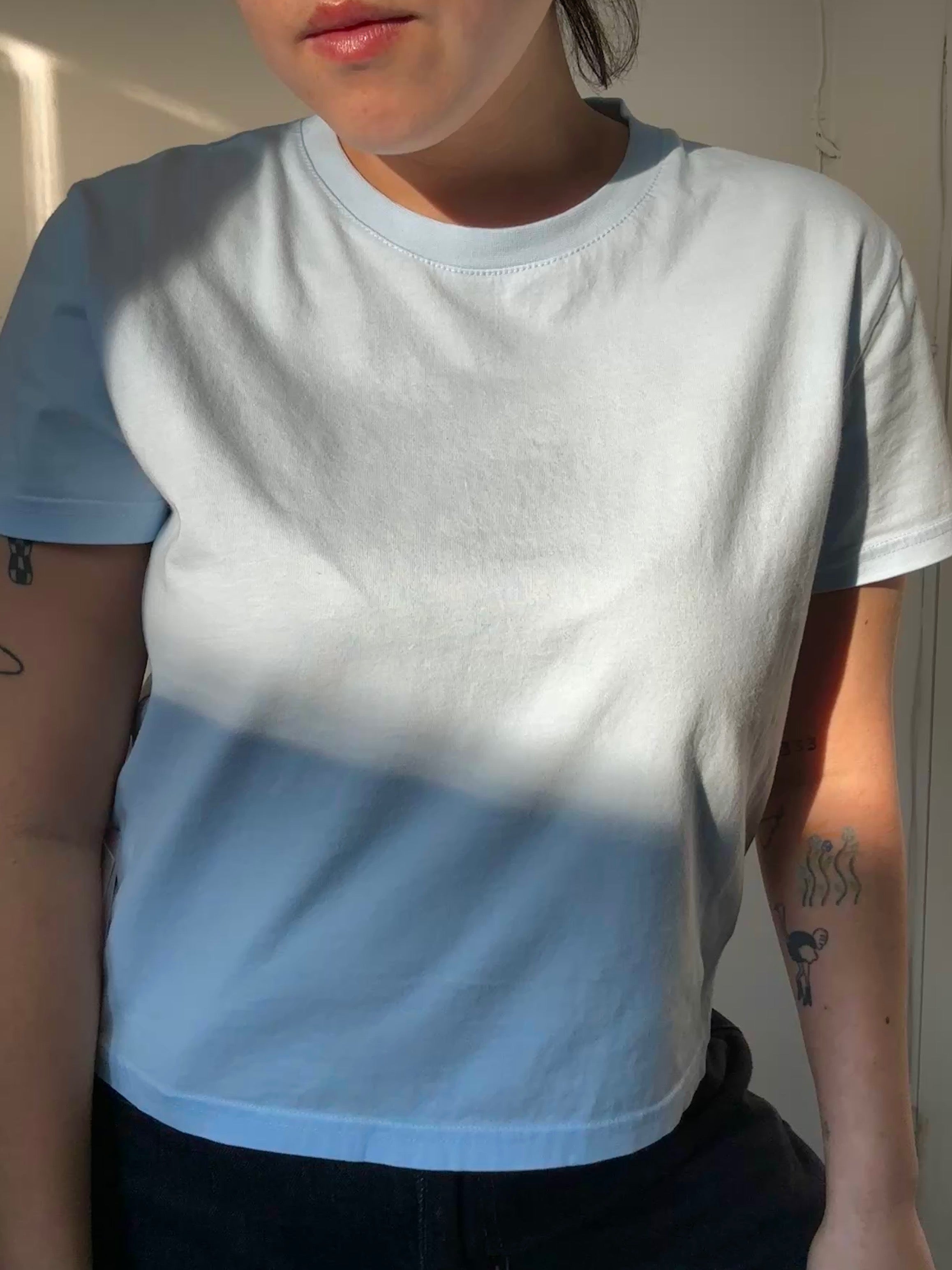 Crafted with premium materials and attention to detail, this tee is designed to elevate your everyday look with its modern silhouette and flattering fit. The boxy cut of this tee offers a relaxed yet structured shape that drapes beautifully. The cropped length lies comfortably just on the hip, making it the perfect choice for pairing with jeans, skirts, or shorts for a modern style that's ready for any occasion.