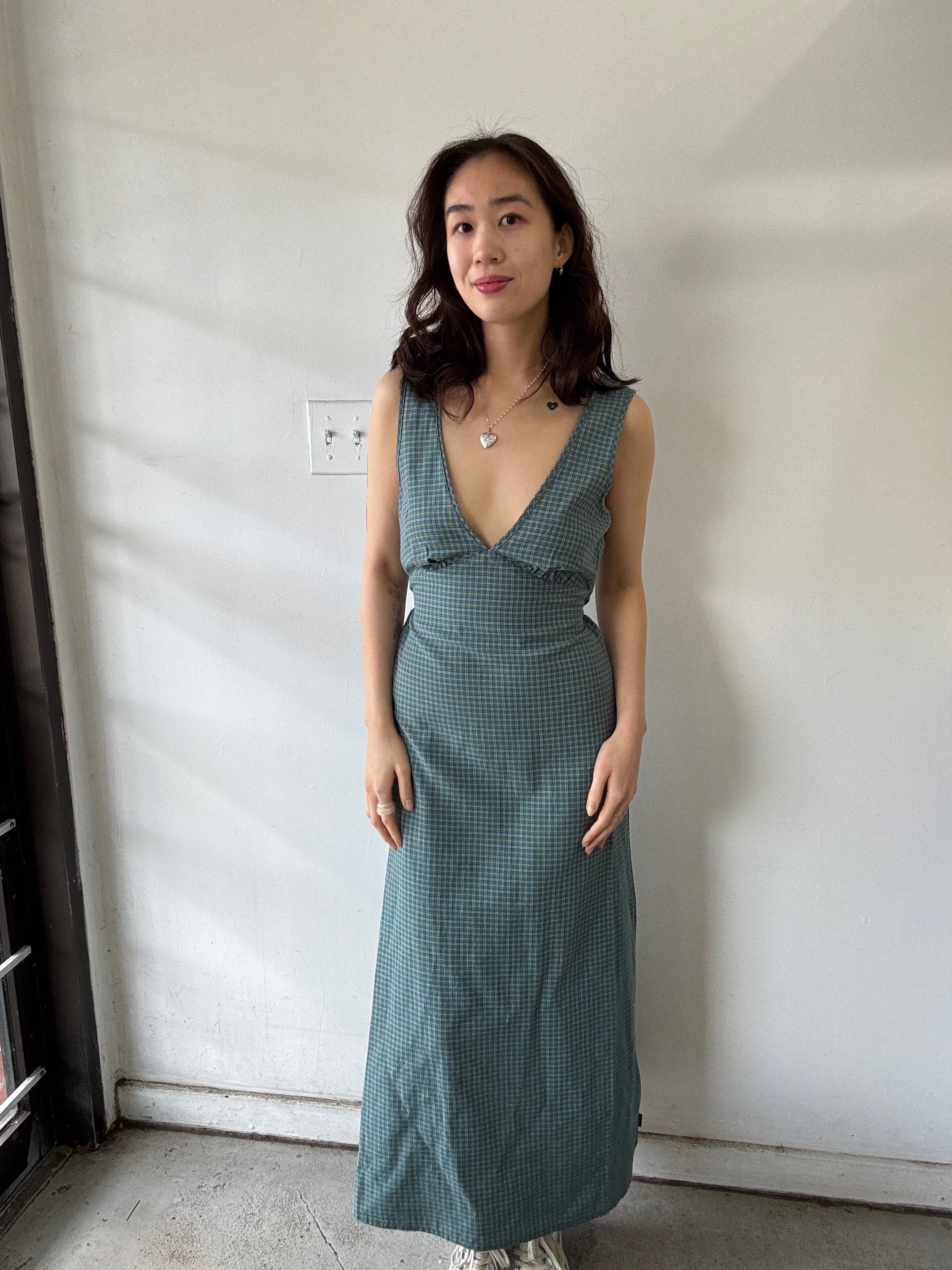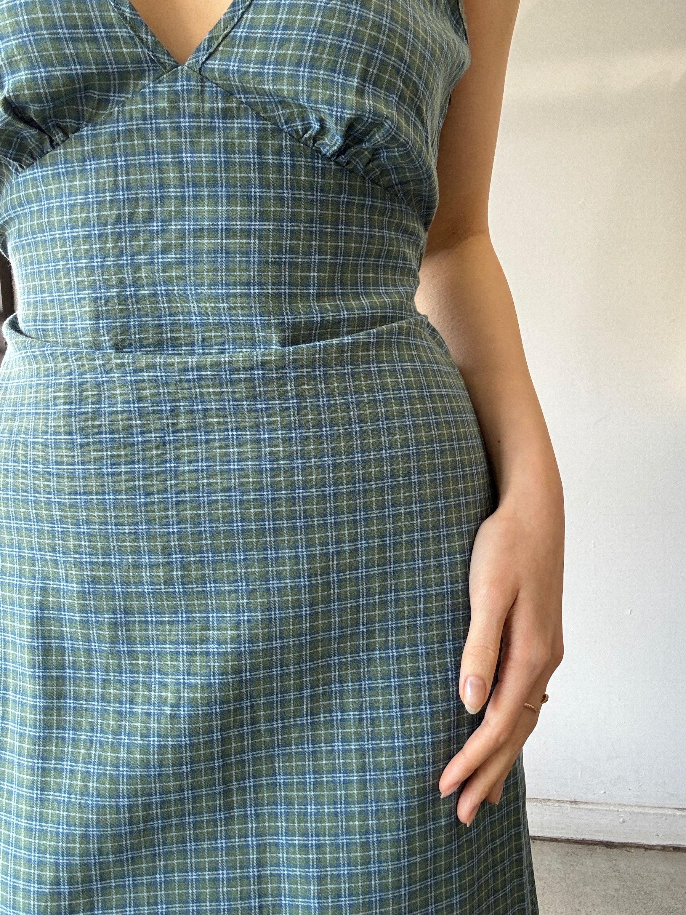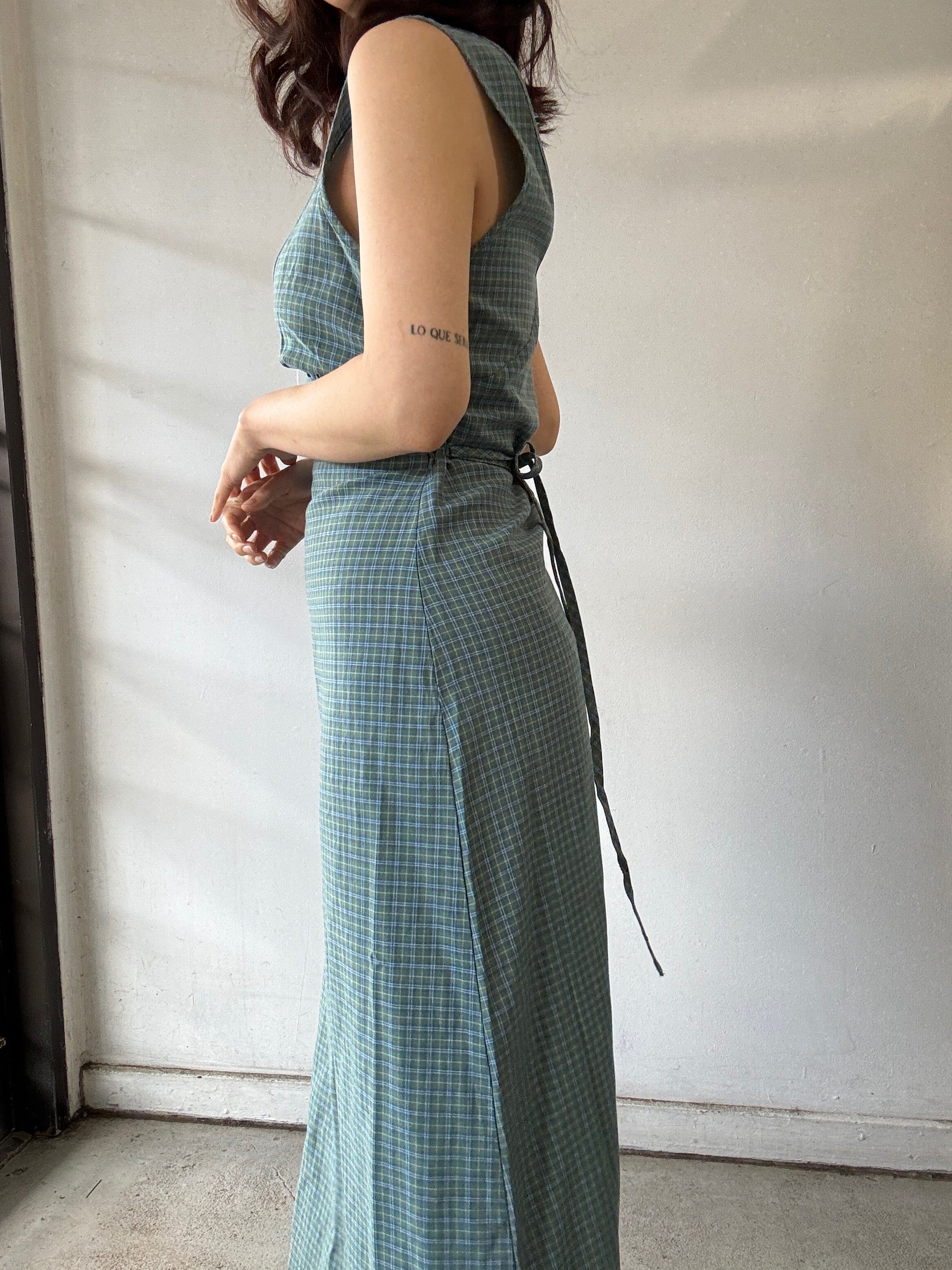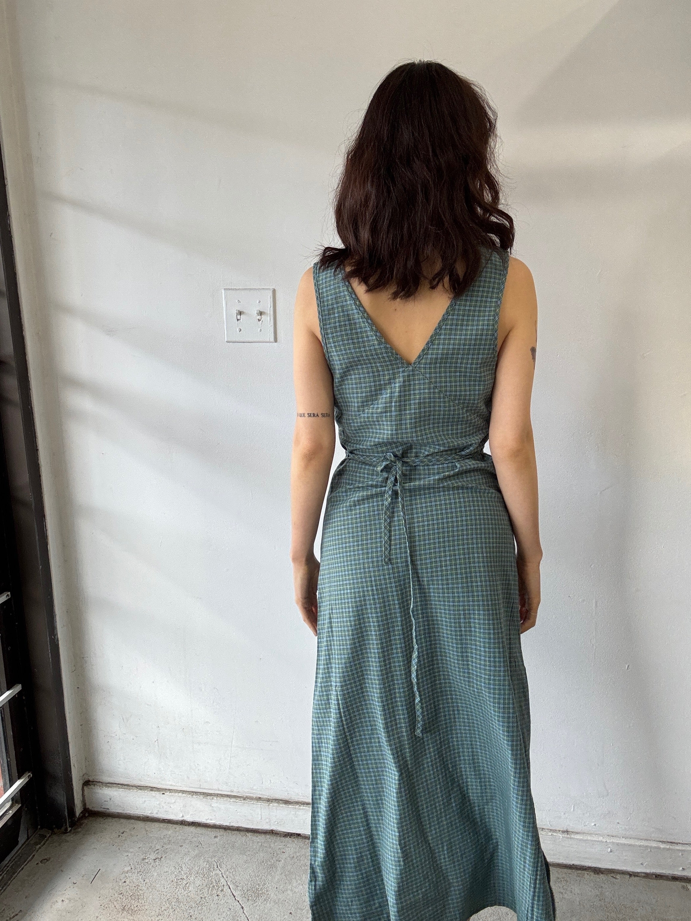 Introducing the 'Voyager' Maxi Dress in deep olive check. Designed with a relaxed fit, v-neck, invisible side zip, right side split and removable waist tie. Made from a lightweight blend of recycled cotton and lyocell.