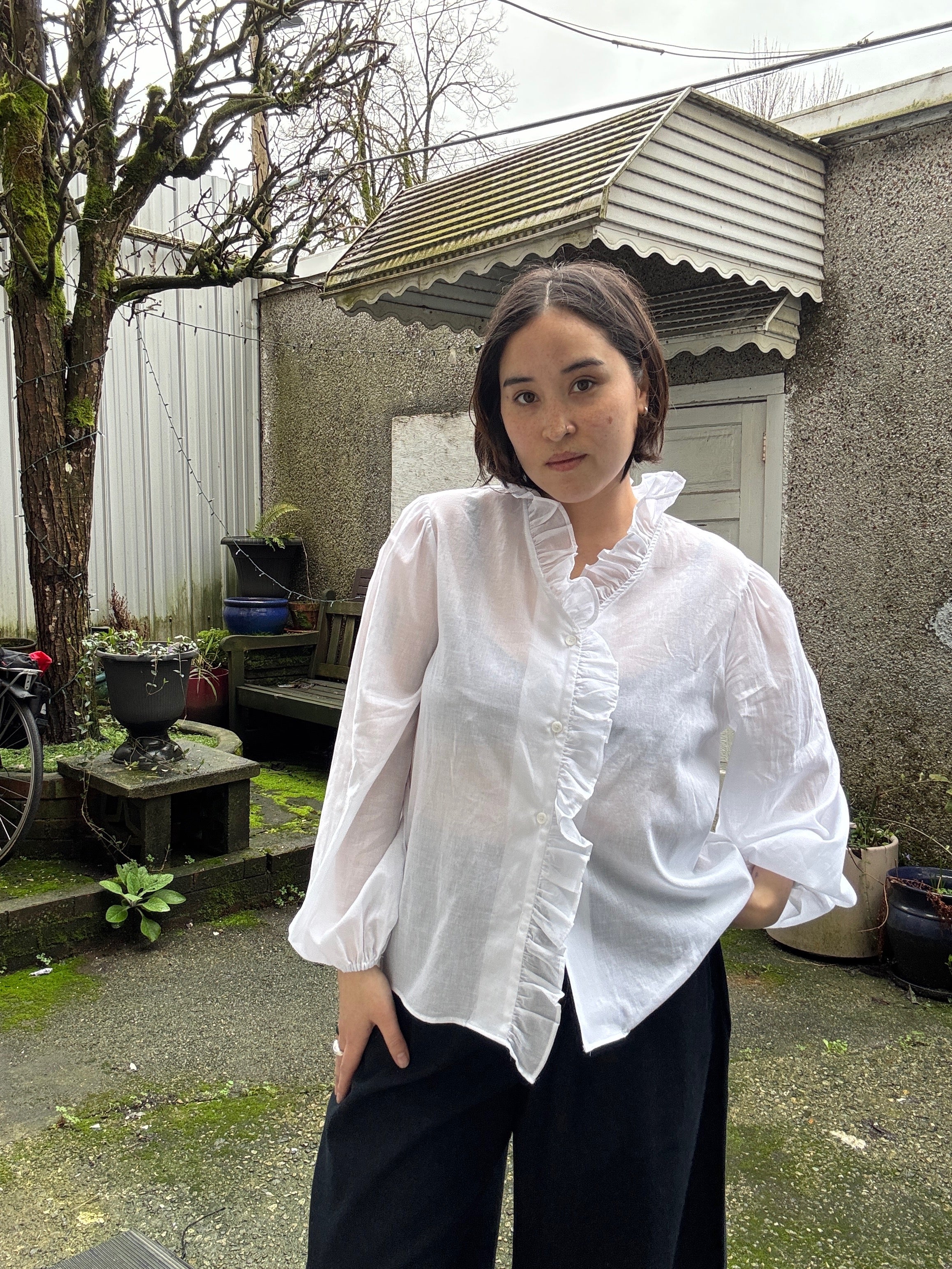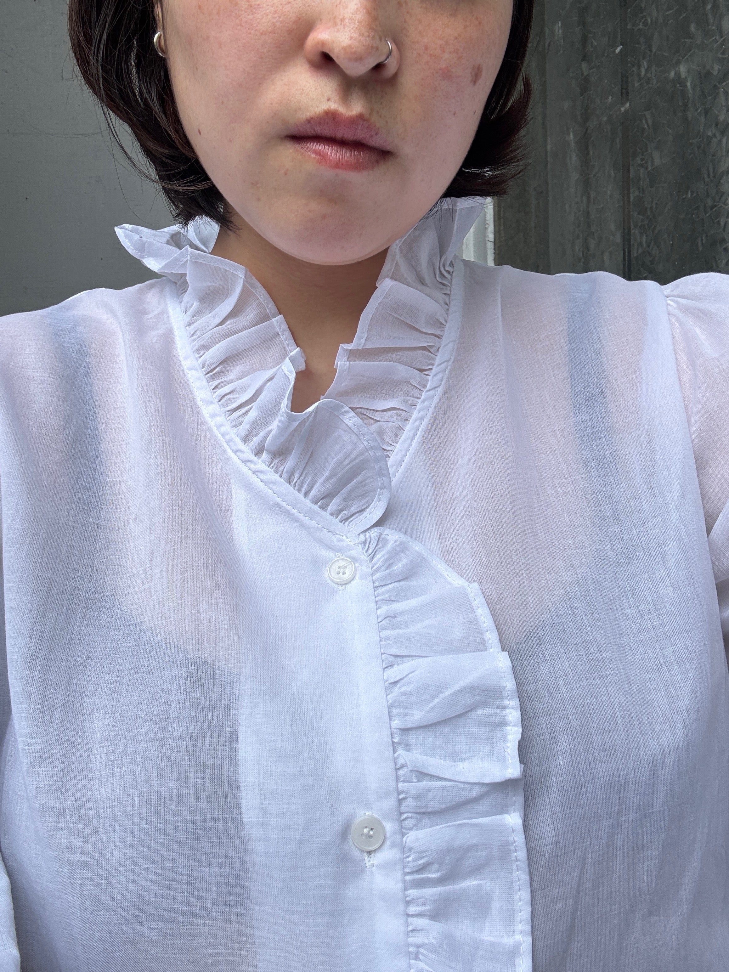 Effortlessly chic and undeniably flirty, this oversized blouse brings the perfect balance of elegance and ease. The sheer fabric creates an airy, romantic vibe, while delicate ruffle trim adds a playful touch that catches the light beautifully. Layer it over a slip or camisole for a sophisticated look, or wear it solo for maximum drama. Whether you're dressing up for brunch or keeping it casual, this versatile piece is your new go-to for making an understated statement.