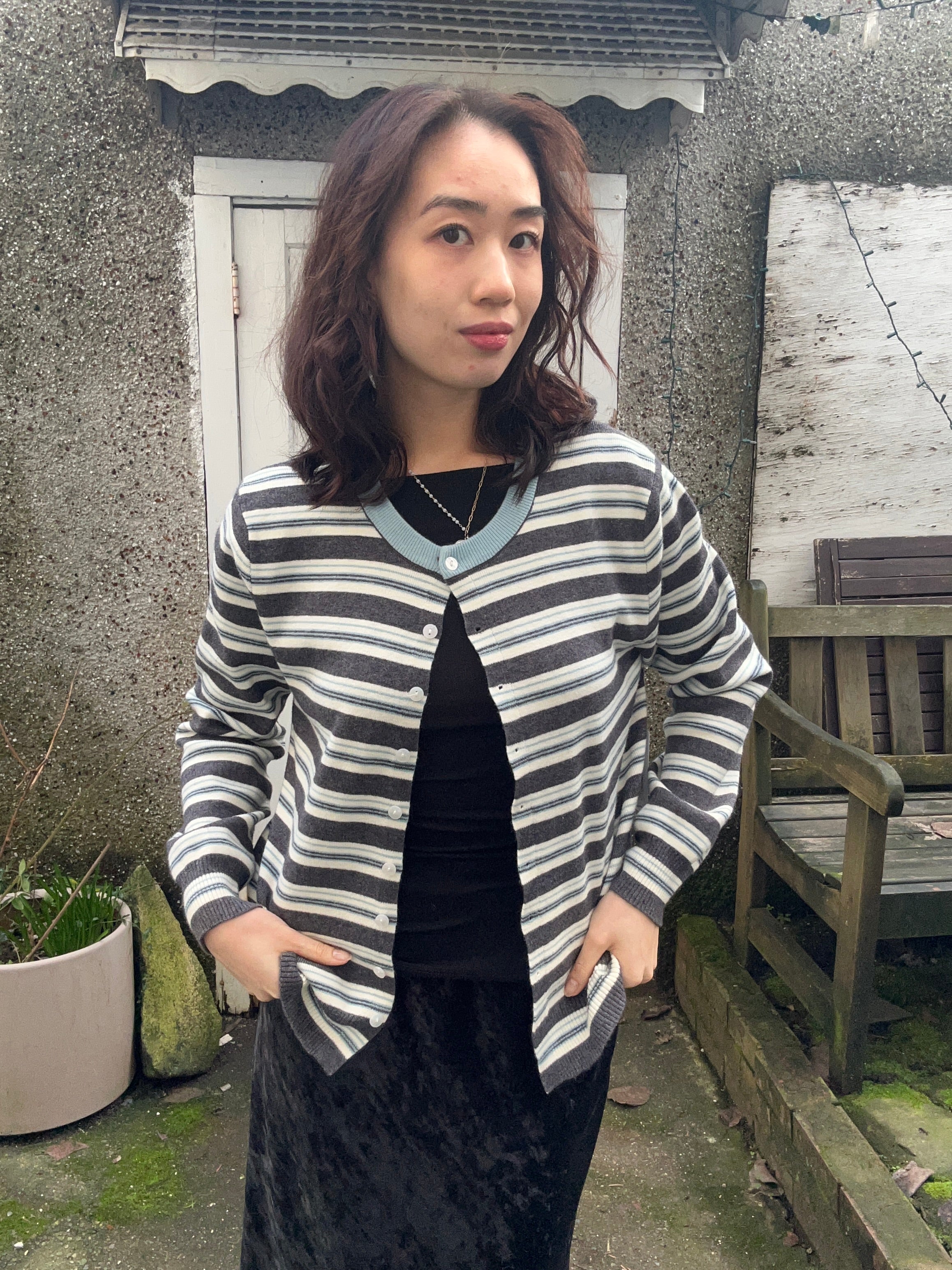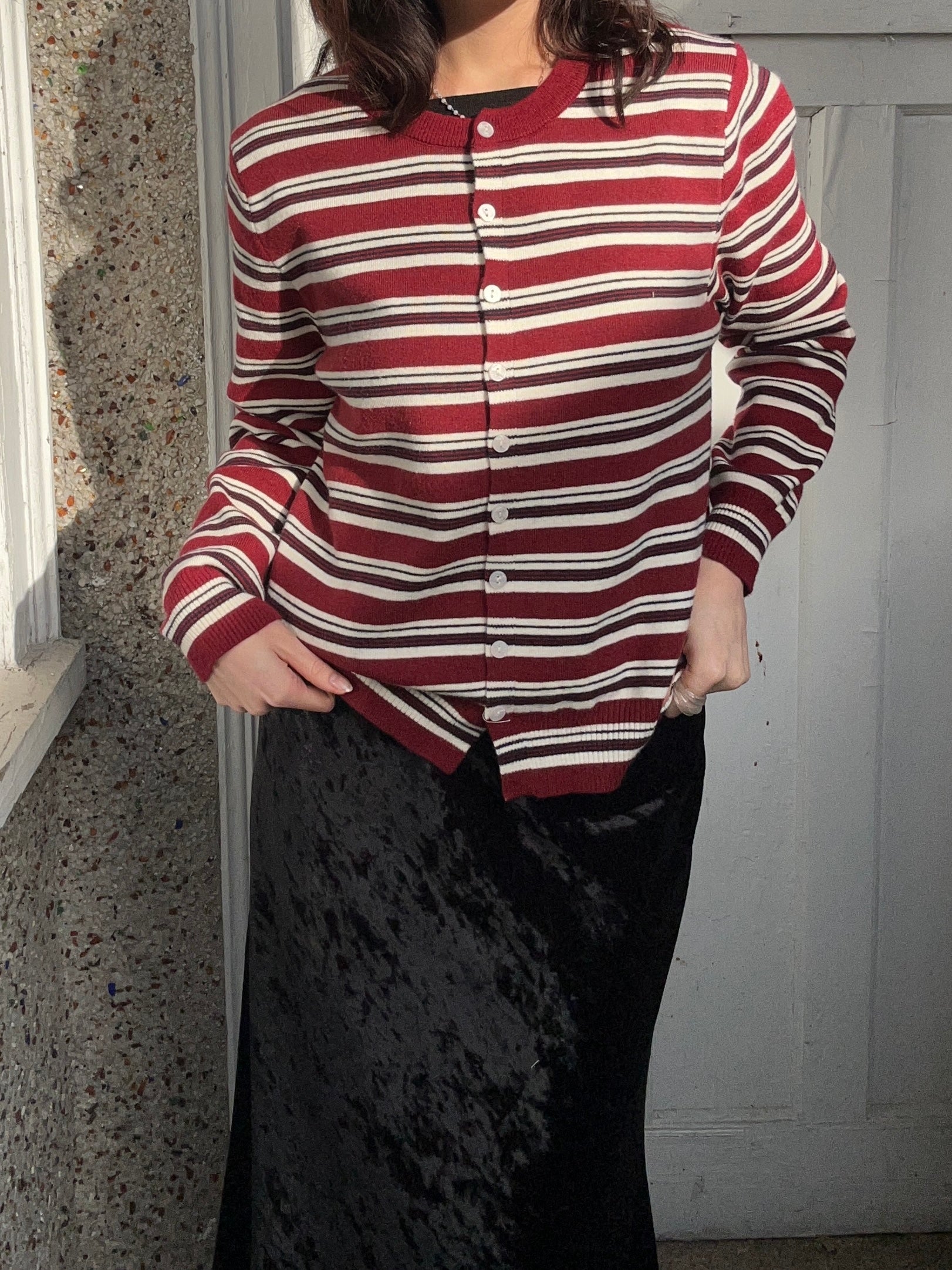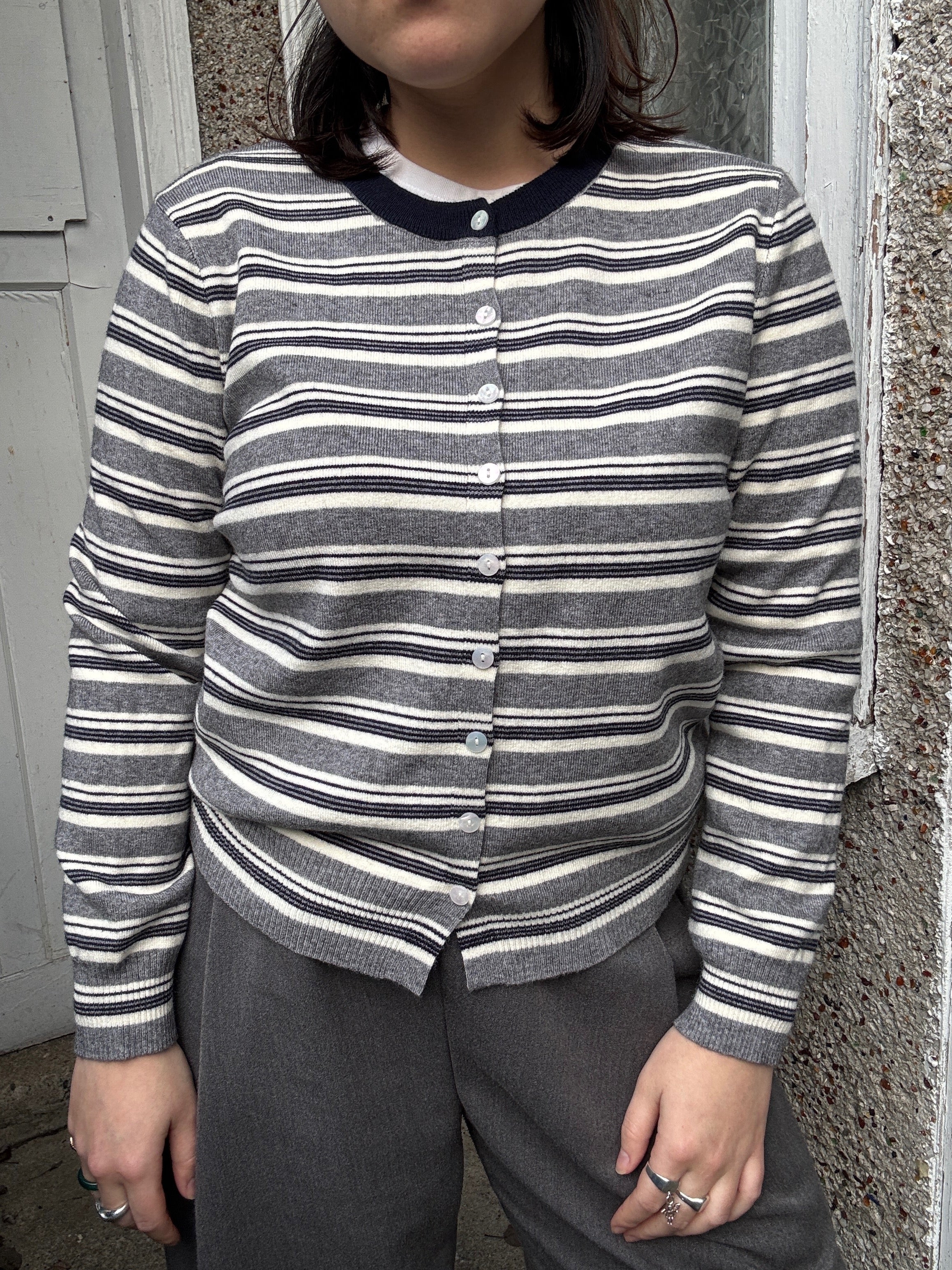 Layer up with this charming striped cardigan that's ready for anything! Featuring a classic crew neck and easy button-up front, it's the perfect piece to throw over your favorite tee or dress. The timeless stripe pattern adds visual interest while keeping things effortlessly cool. Cozy, versatile, and endlessly stylish—your new go-to for casual days and dressed-up moments alike.