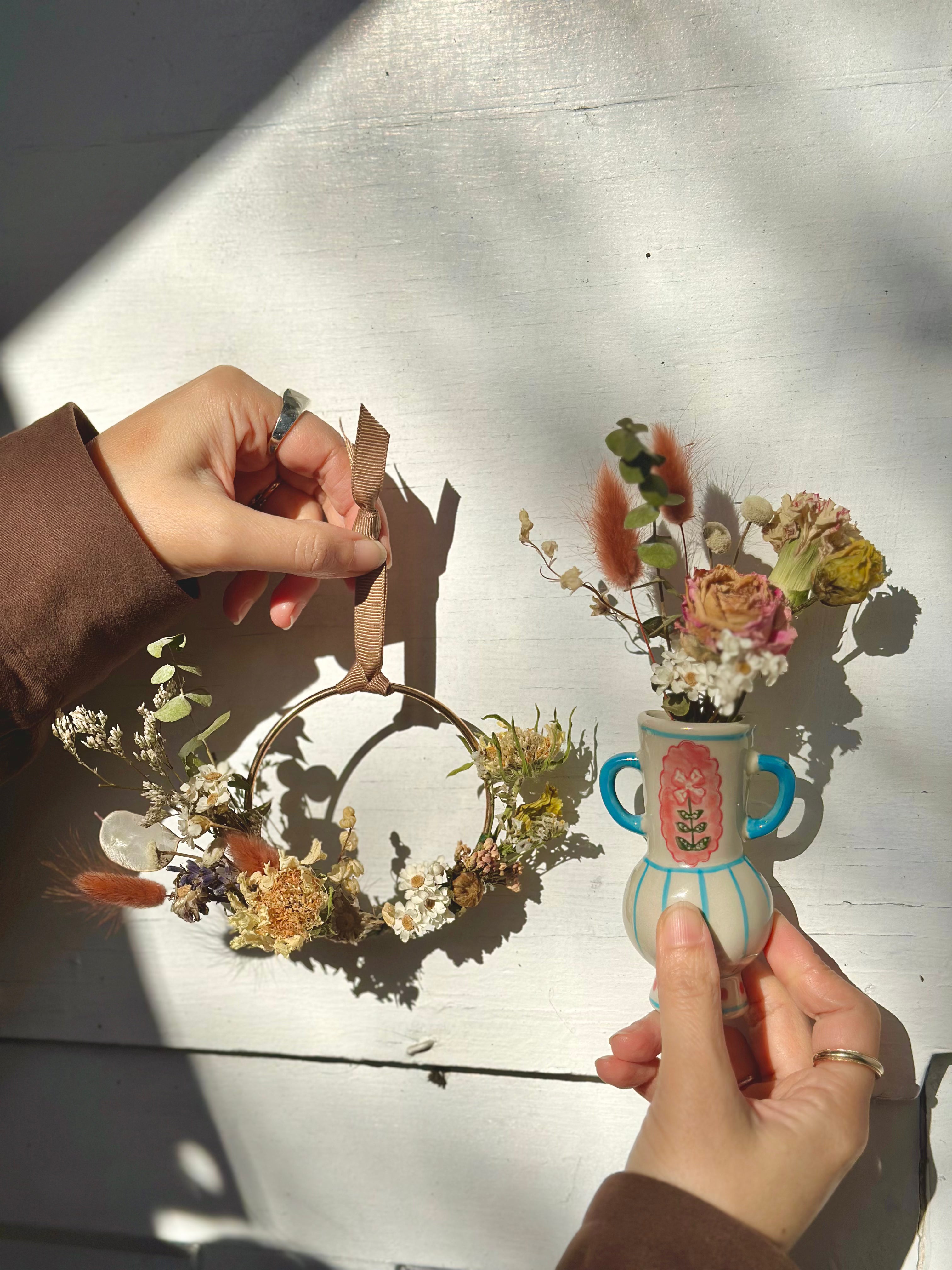 All guests will leave with a mini dried wreath and an artfully arranged floral fridge magnet.